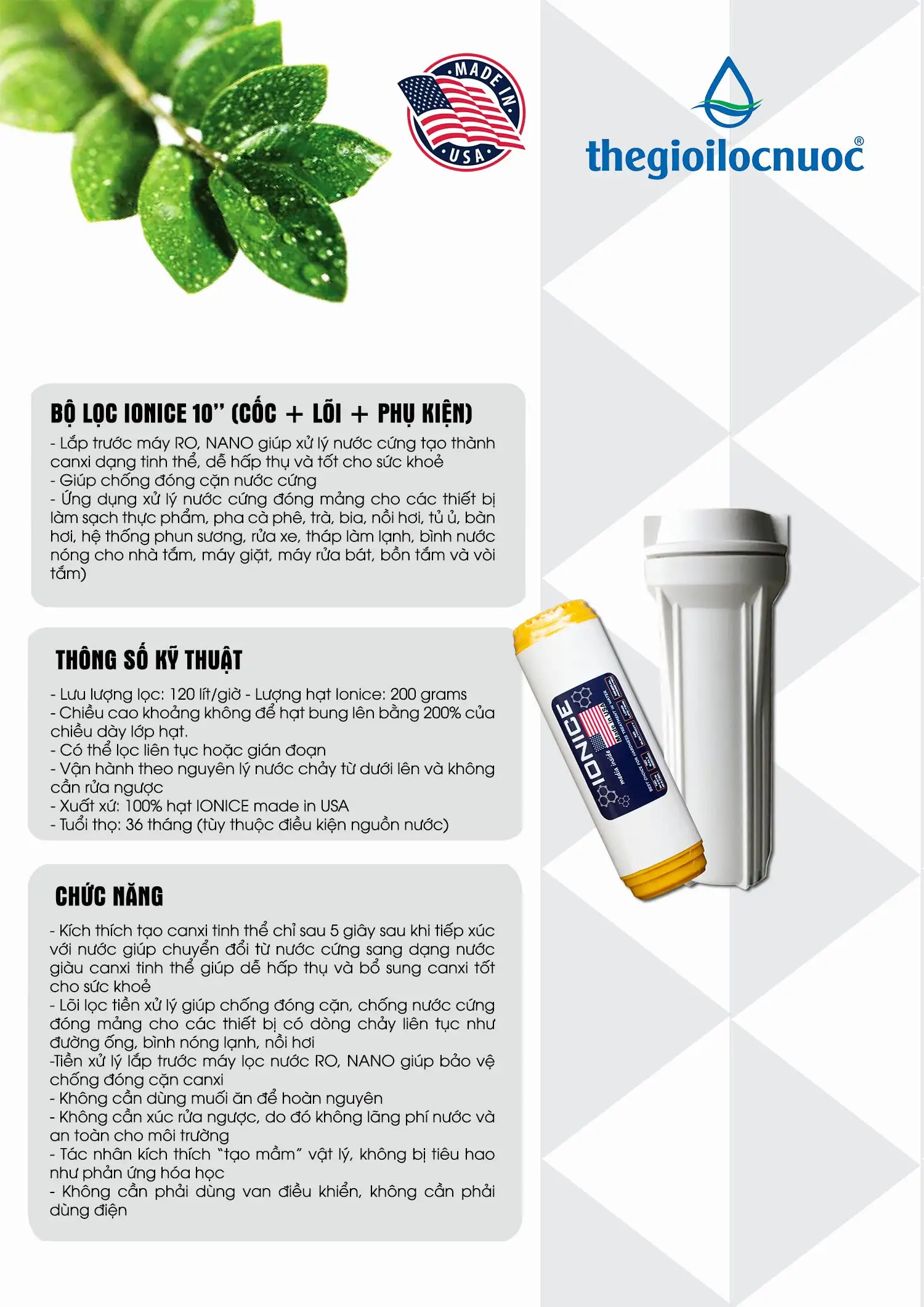 – Lõi lọc tiền xử lý giúp chống đóng cặn, chống nước cứng đóng mảng cho các thiết bị có dòng chảy liên tục như đường ống, bình nóng lạnh, nồi hơi – Tiền xử lý lắp trước máy lọc nước RO, NANO giúp bảo vệ chống đóng cặn canxi – Không cần dùng muối ăn để hoàn nguyên – Không cần xúc rửa ngược, do đó không lãng phí nước và an toàn cho môi trường – Tác nhân kích thích “tạo mầm” vật lý, không bị tiêu hao như phản ứng hóa học – Không cần phải dùng van điều khiển, không cần phải dùng điện |