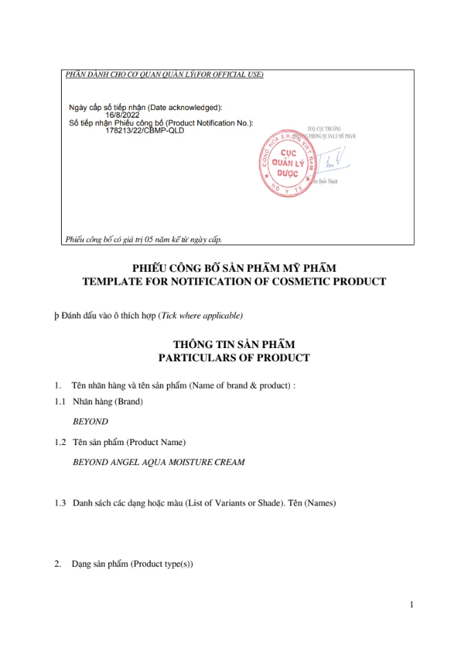 Thành phần Kem dưỡng ẩm dịu da Beyond Angel Aqua Moisture Cream