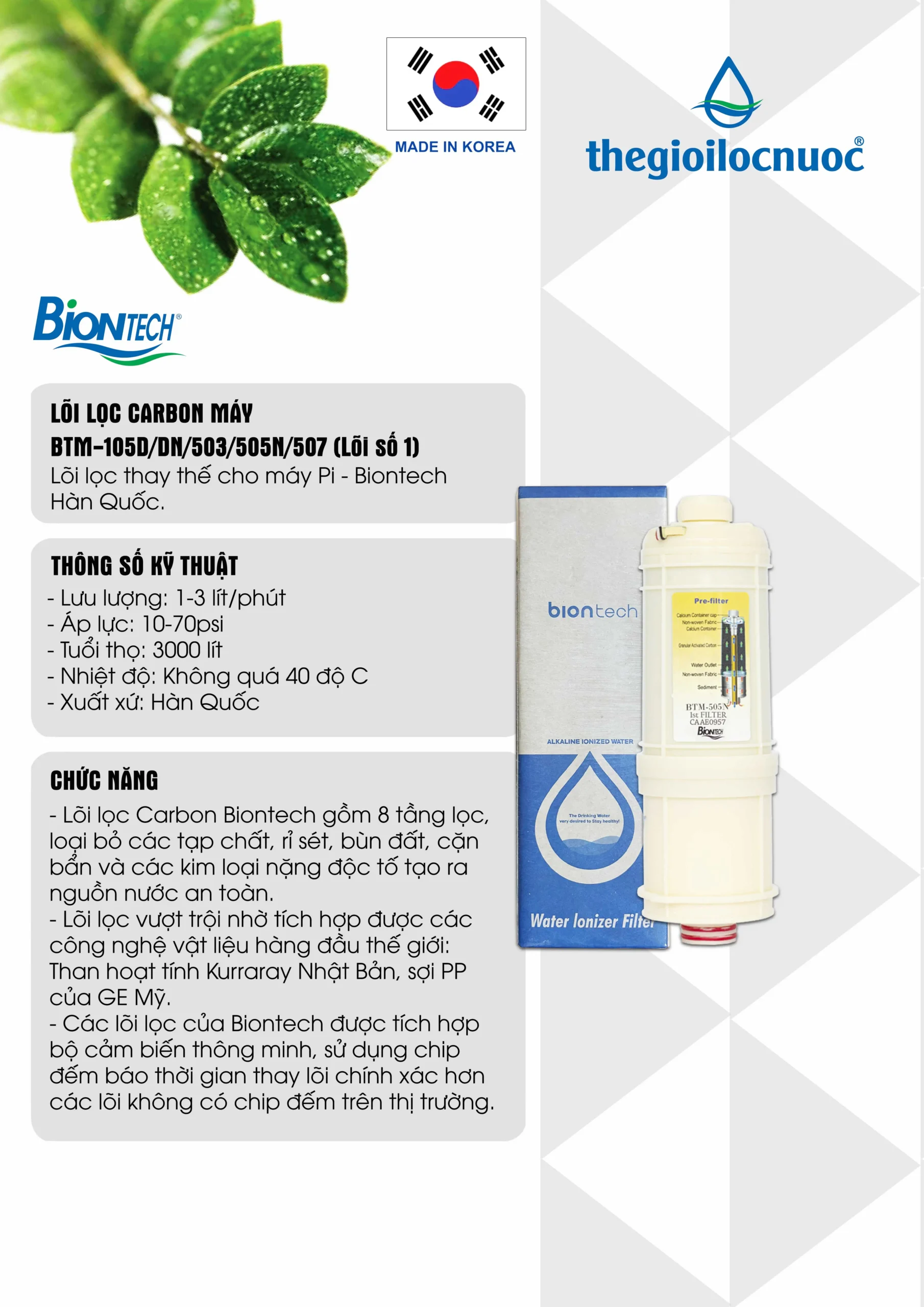 - Lõi lọc Carbon Biontech gồm 7 tầng lọc, loại bỏ các tạp chất, rỉ sét, bùn đất, cặn bẩn và các kim loại nặng độc tố tạo ra nguồn nước an toàn.