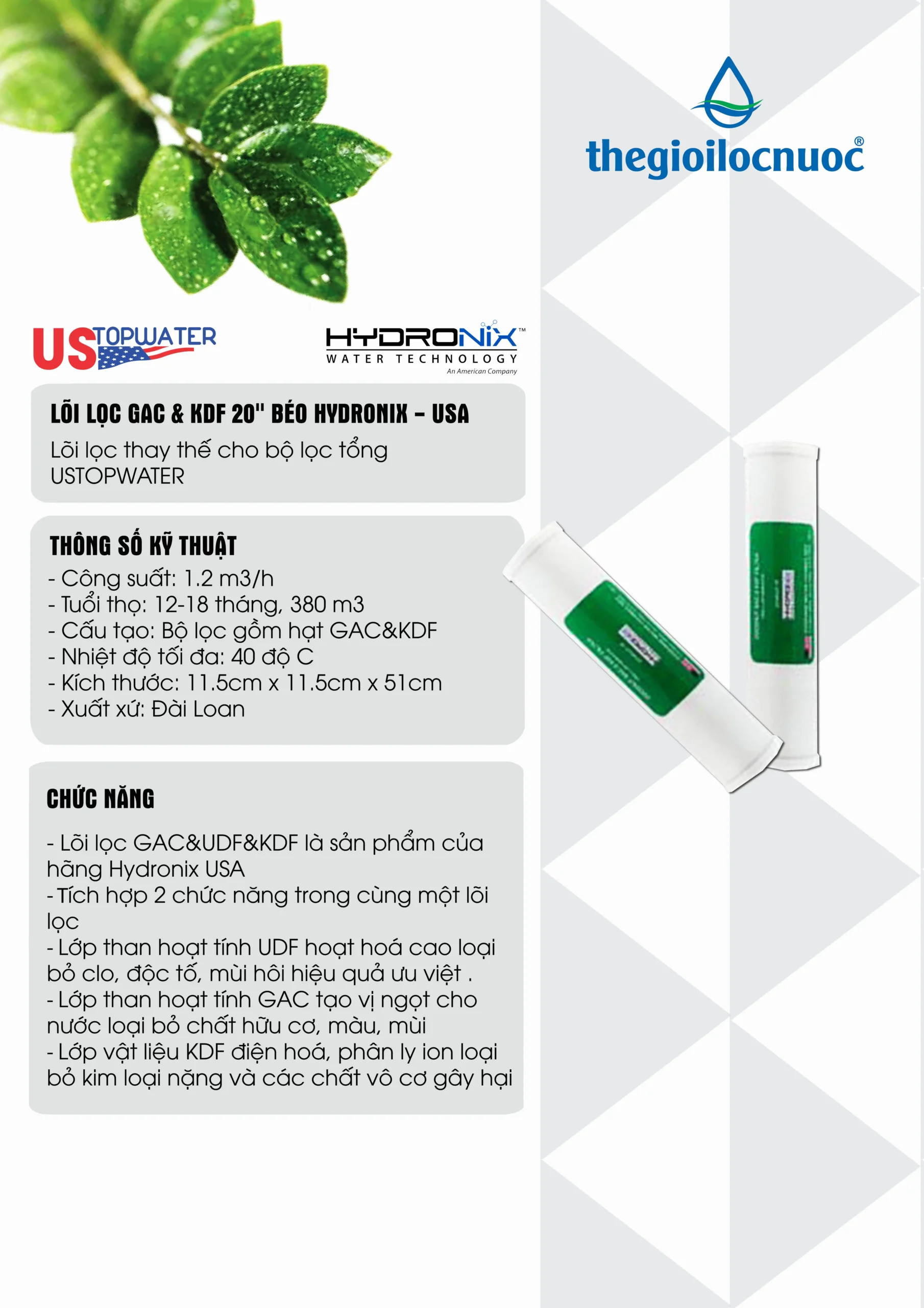 - Tên sản phẩm: LÕI LỌC GAC & KDF 20” BÉO HYDRONIX – USA