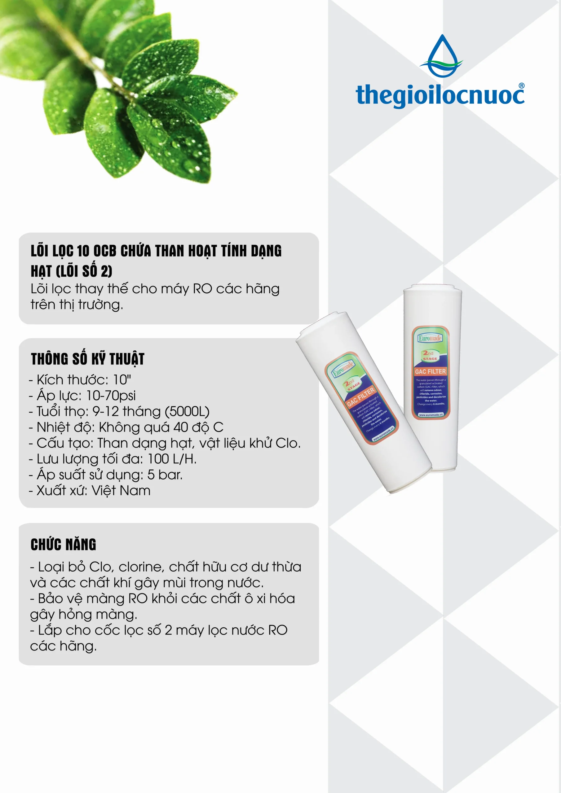 Chức năng: Loại bỏ Clo, clorine, chất hữu cơ dư thừa và các chất khí gây mùi trong nước. Bảo vệ màng RO khỏi các chất ô xi hóa gây hỏng màng. Lắp cho cốc lọc số 2 máy lọc nước RO các hãng.