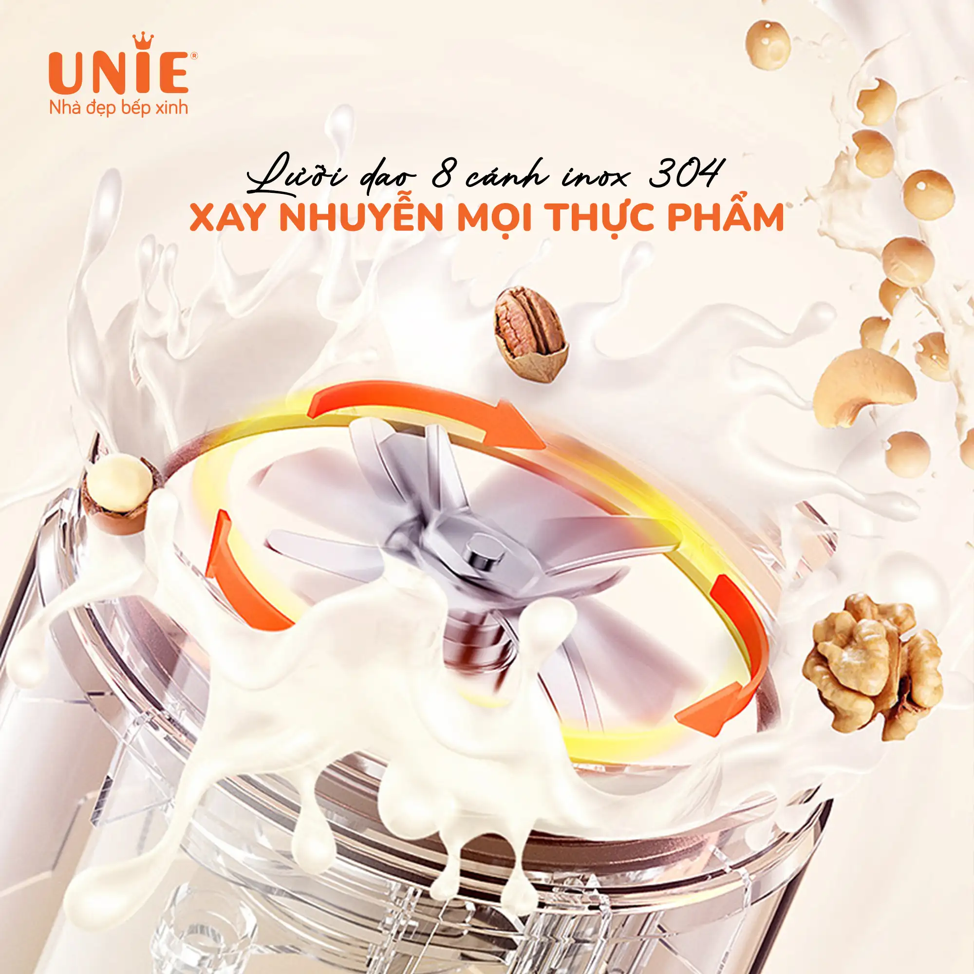 Cải tiến mới nhất trên phiên bản Unie VX với lưỡi dao 8 cánh bằng inox 304. Kết hợp với công suất xay nấu mạnh mẽ để xay nhuyễn các loại hạt, tạo ra những ly sữa hạt thơm ngon sánh mịn.