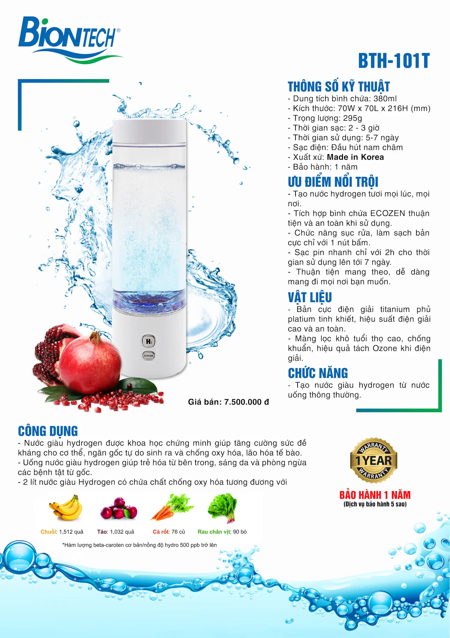 Giấy tờ sản phẩm Máy tạo nước hydrogen dạng cầm tay tích hợp bình chứa Biontech, model: BTH-101T