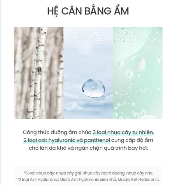 - Công thức dưỡng ẩm chứa 3 loại nhựa cây tự nhiên (cây gai, bạch dương, nho)